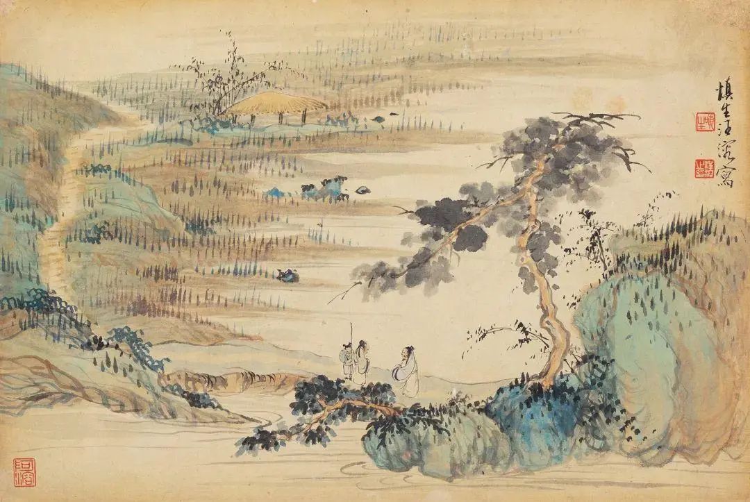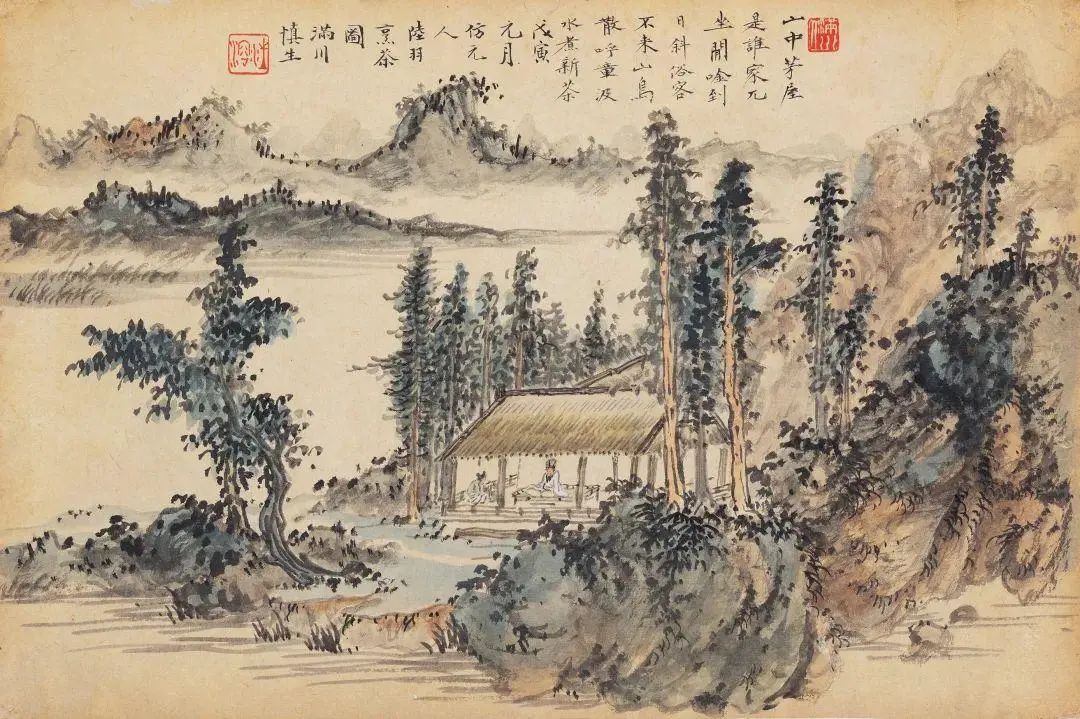 3、山中茅庐是谁家,兀坐闲吟到日斜。俗客不来山鸟散,呼童打水煮新茶。戊寅元月,仿元东说念主陆羽烹茶图,满川慎生。